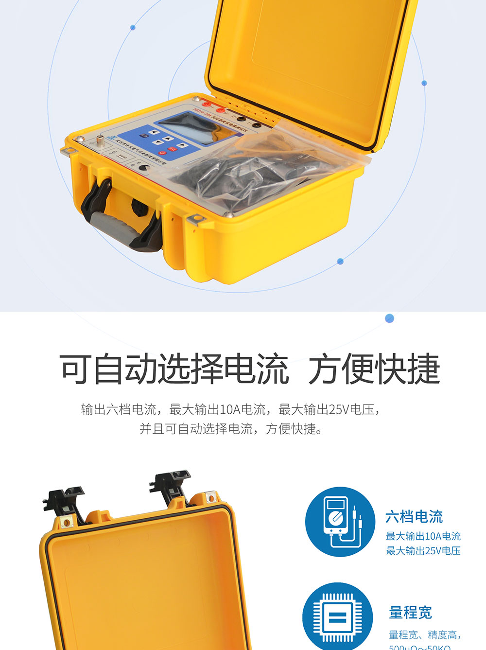 直流電阻測試儀 HZ210-10A 變壓器直流電阻測試儀是一款創新型產品,內置大容量鋰電池,儀器與測試線采用機線一體設計,產品體積小巧,便于攜帶。產品不僅適合變壓器、互感器、電抗器等感性試品的測量,而且適合銅排、導線、開關觸點等阻性試品的測量,儀表測試速度快、準確度高。